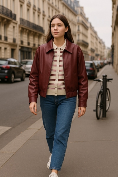 Quick view Add to cart granate bomber ecopiel granate Precio 59,95 € Chaqueta bomber con cuello de camisa y cremallera central. Manga larga , con puño elástico en la parte inferior . Bolsillos laterales . Ideal para...