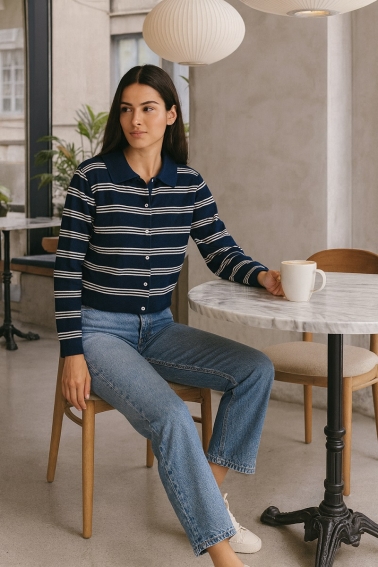 Quick view Add to cart cafe chaqueta cuello polo rayas... Precio 39,90 € Chaqueta tipo polo a rayas , un chaqueta muy funcional , con manga larga y cuello camisero , en tejido de punto elástico . Composición : 45%...