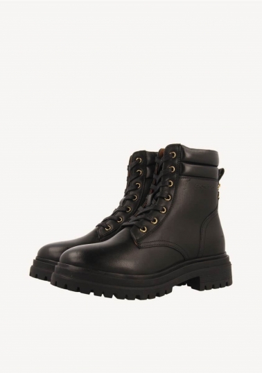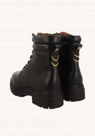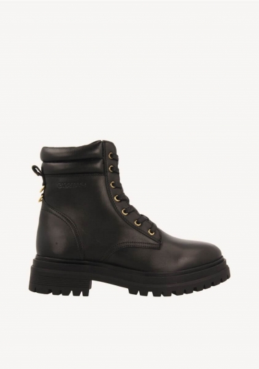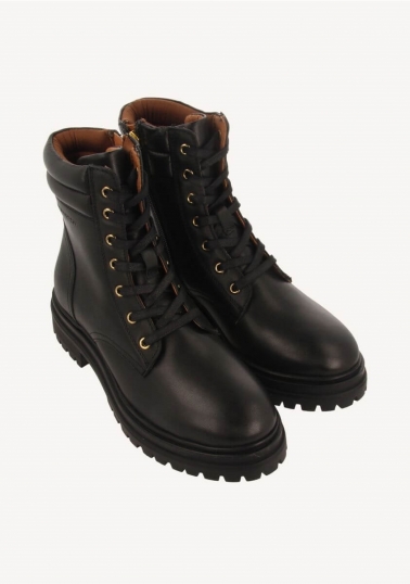 Pisa fuerte con las novedades de temporada. Botas negras estilo militar de piel con suela gruesa tipo track. Cuentan con plantilla muy acolchada y piso flexible. El corte, la plantilla y el forro están hechos de piel curtida en tenerías que siguen un proceso más sostenible según los estándares de Leather Working Group (LWG). La hilatura de los tejidos utilizados en la fabricación del forro tiene el sello de garantía certificada Global Recycle Standard (GRS). Altura del tacón: 4cm. ¡Un imprescindible en cualquier