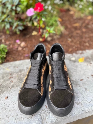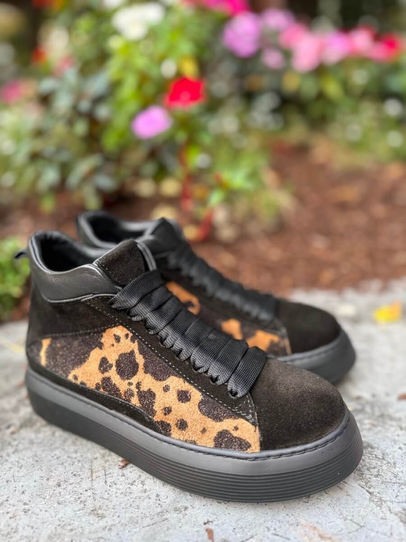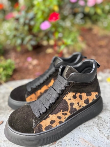Fabricados en piel y ante, presentan un acabado negro con estampado animal marrón que aporta un toque sofisticado y atrevido. Su suela de plataforma negra garantiza confort durante todo el día, mientras que el corte tipo sneaker alta ofrece un ajuste moderno y favorecedor.