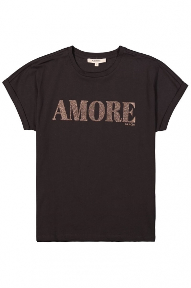 Camiseta de algodón con estampado de texto con purpurina en el pecho . Una divertida versión de un básico atemporal. Esta camiseta tiene manga corta, cuello redondo y corte regular. Está confeccionada con 50 % algodón y 50 % algodón reciclado. Esta prenda GARCIA está confeccionada con hilo reciclado. Los materiales reciclados se fabrican a partir de materiales de desecho, que posteriormente se convierten en materias primas.