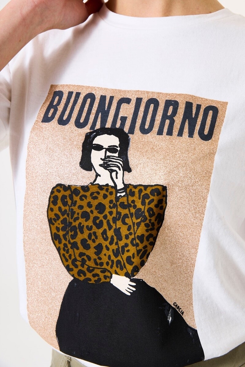 Elegante camiseta con un llamativo estampado en el pecho. Esta camiseta presenta cuello redondo, manga corta y corte regular, ideal para el día a día. Está hecha 100 % de algodón, lo que garantiza un ajuste cómodo.