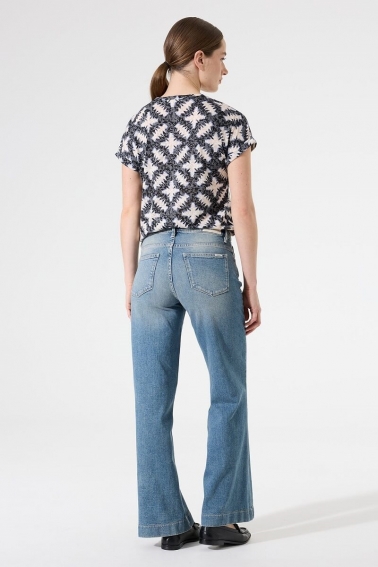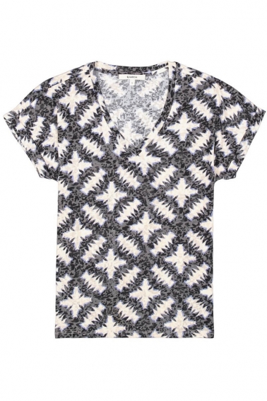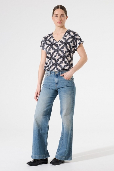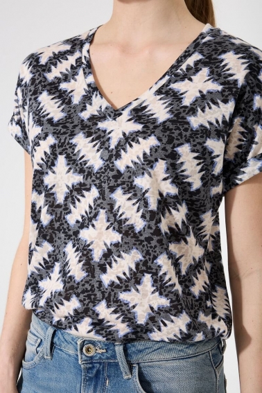 Camiseta con efecto desgastado y estampado integral. Una prenda con un estampado moderno. Esta camiseta tiene manga corta, cuello en V y corte regular. Está confeccionada con un 75 % de poliéster reciclado y un 25 % de viscosa.