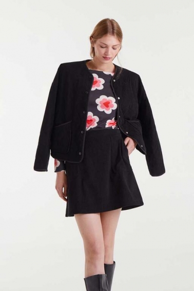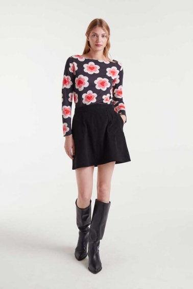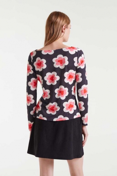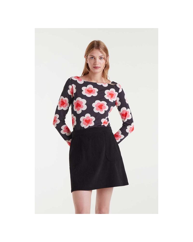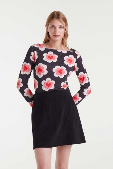 Camiseta de manga larga ,estampado de flores y corazones de color negro . Con cuello redondo.
