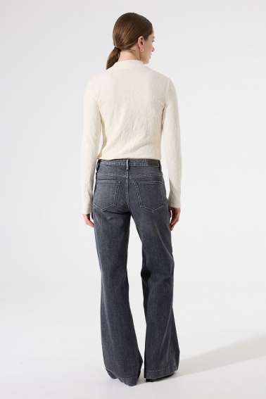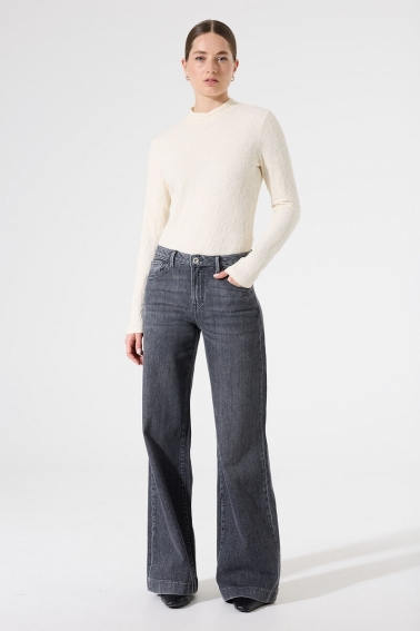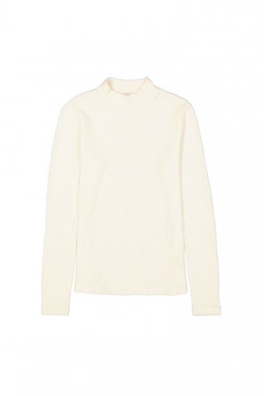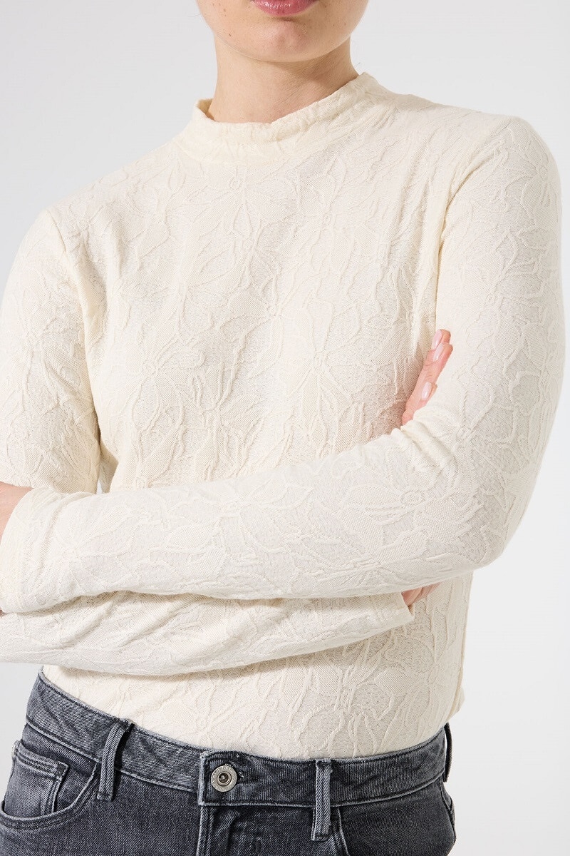 Camiseta manga larga con cuello tortuga , en tejido con textura haciendo flores .