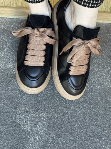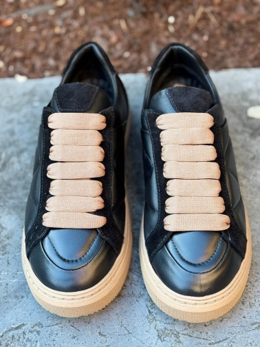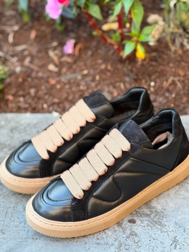 Deportivas en contraste de tejidos serraje y piel negras , con piso en goma color caramelo al igual que los cordones . Una deportiva ultraligera de nuestra firma italiana Shaddy .