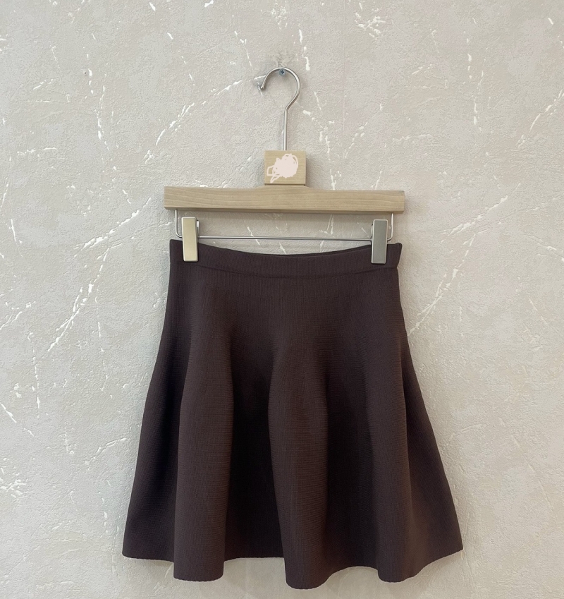Falda corta elástica con vuelo, disponible een dos colores marrón y burdeos .