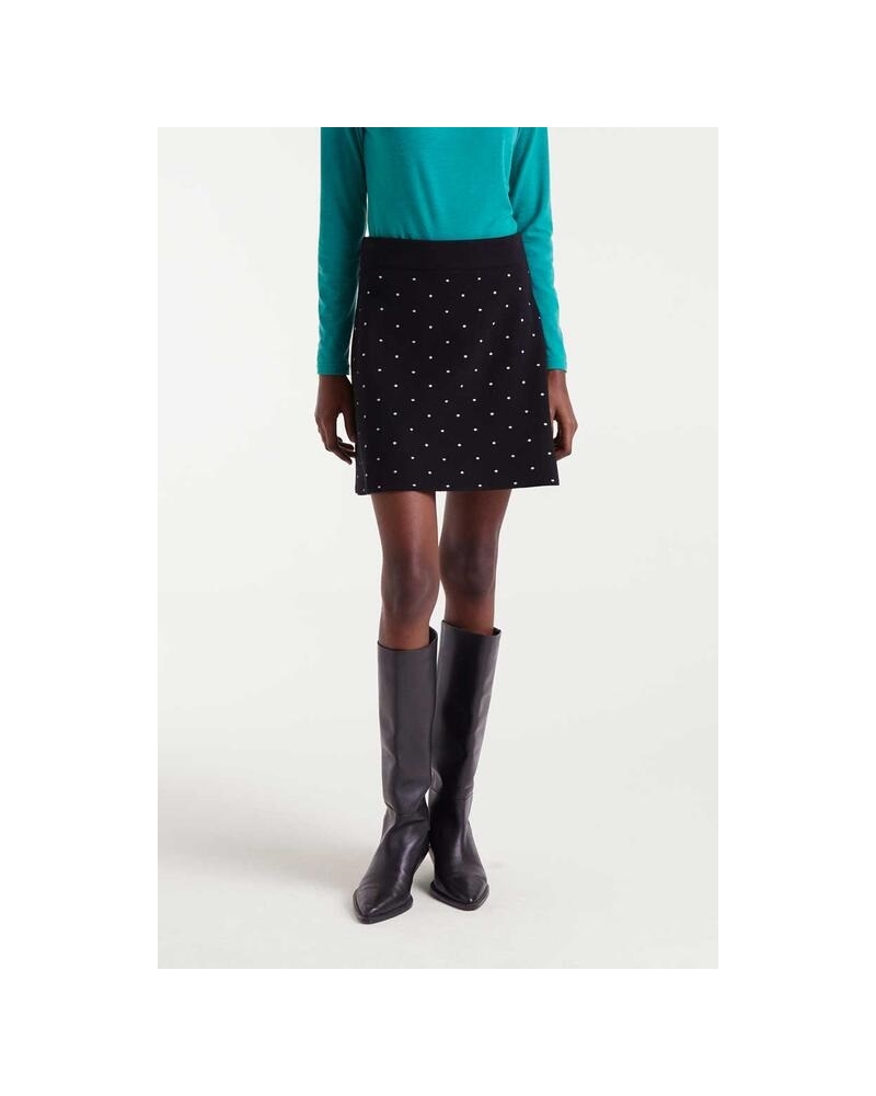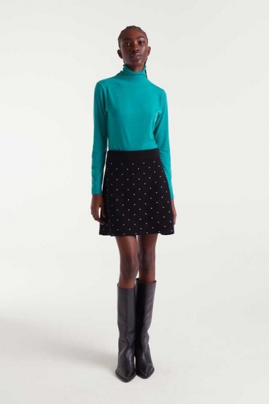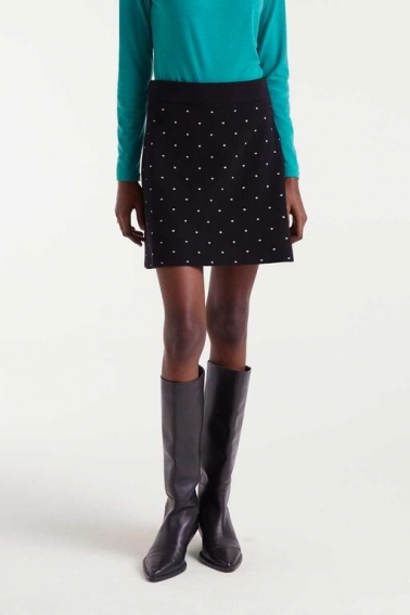 Falda corta punto jacquard con estampado mini black. Con cintura elástica y tiro medio. La modelo mide 178 cm y lleva la tasa S. COMPOSICIÓN: 58% Acrylic 27% Viscose 15% Polyamide | CUIDADO: Lavar a máquina en agua fría, no usar blanqueador, no usar secadora, secar colgado a la sombra, no planchar, lavar con colores similares | Forro: No.