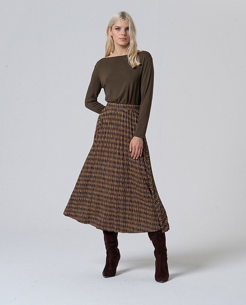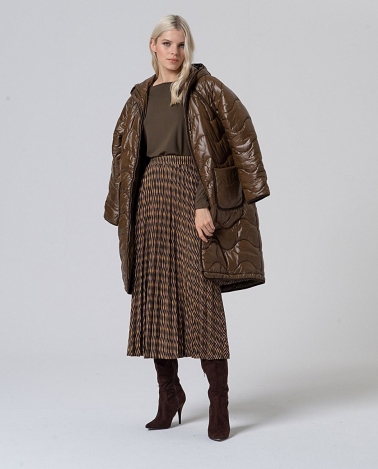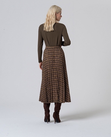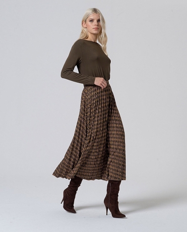 Falda plisada larga elástica , estampada de color verde . Composición : 50%Poliéster Reciclado 46%Plástico 4%Elastano