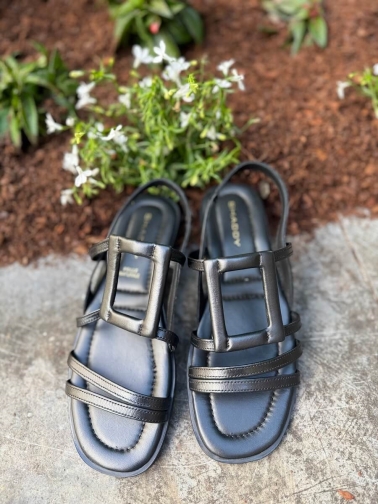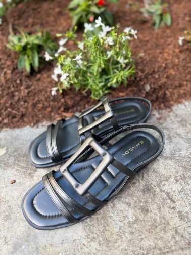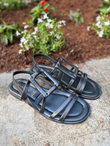 Sandalia baja de piel negra , con diseño elegante y minimalista , acentuada por una hebilla forrada oversize. Creación de la firma italiana Shaddy , combina confort y estilo , para el uso diario o eventos casuales .