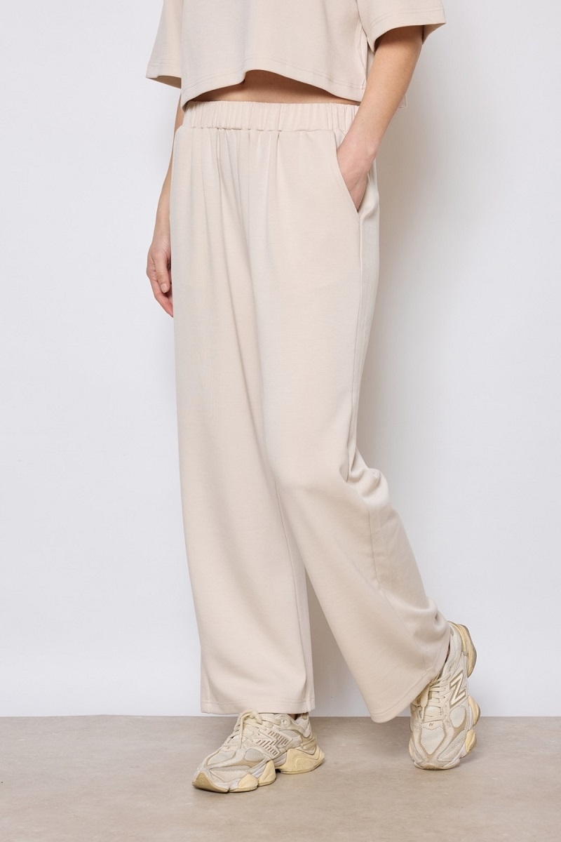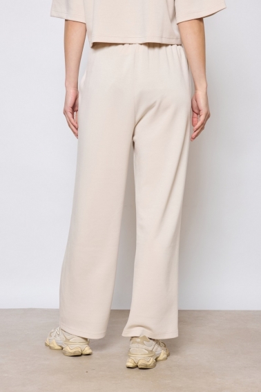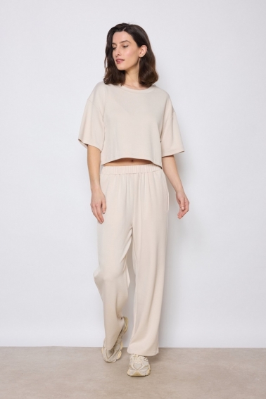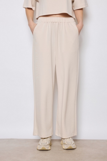 Pantalón recto fluido de talle alto , con cintura elástica . Bolsillos laterales.