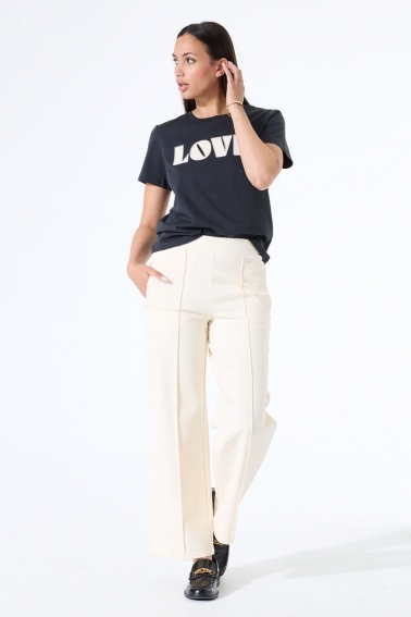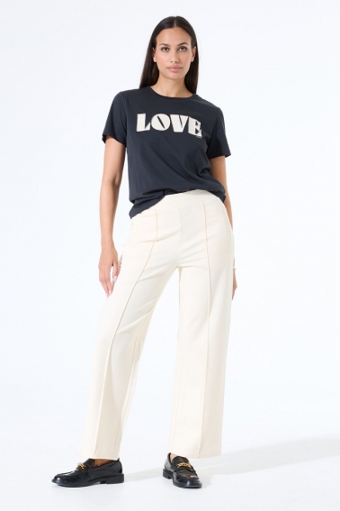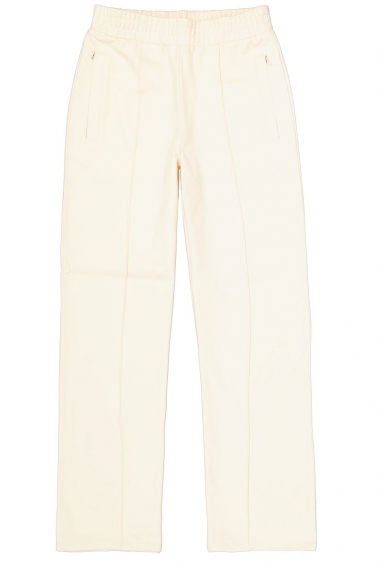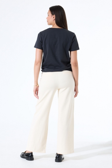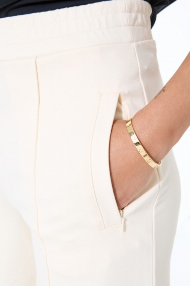 Pantalones de punta di roma con costuras decorativas. Presentan cintura media-alta, cinturilla elástica, bolsillos laterales con cremallera y corte recto.