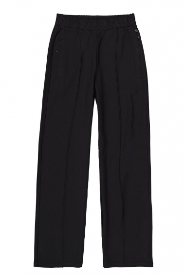 Pantalones de Punta di Roma con costuras decorativas. ¡Cómodos y a la moda! Estos pantalones tienen cintura media-alta, cinturilla elástica, bolsillos laterales con cremallera y corte recto. Esta prenda está confeccionada en 63 % viscosa, 32 % poliamida y 5 % elastano.
