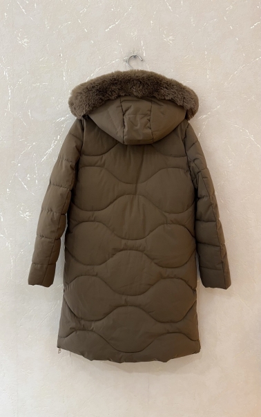 Abrigo acolchado, gorro desmontable con pelo , fuelle lateral con cremallera .