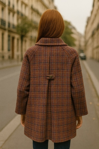 Abrigo de mujer en tono marrón con estampado de cuadros con encuentro en la espalda , diseño clásico y elegante. Tejido cálido