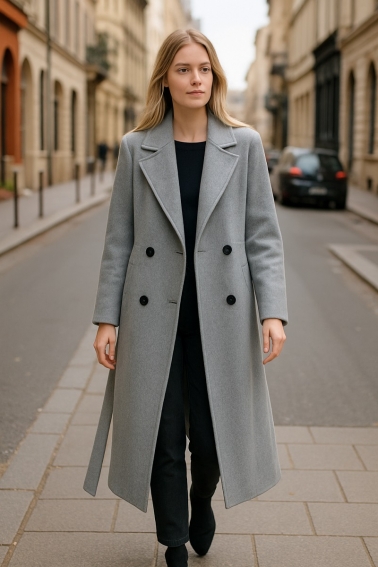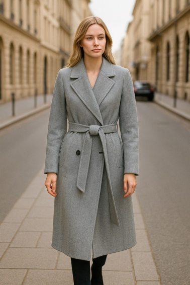 Abrigo largo de paño con cinturón cuello solapa en color gris .