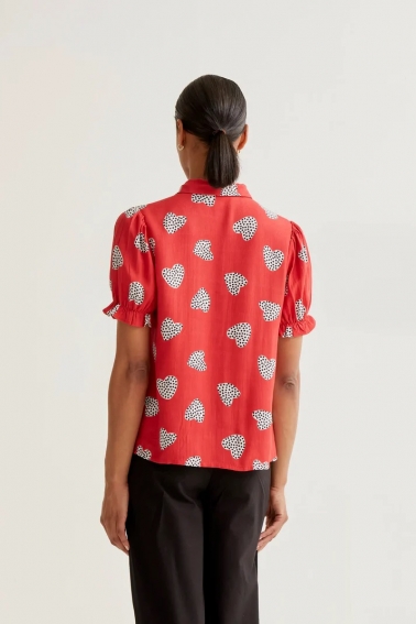 Camisa con estampado harmony red. Cuello camisero y manga corta ligeramente abullonada con detalle de volantes. Cierre frontal con botones de color rojo. La modelo mide 173 cm y lleva la talla S.