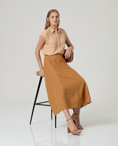Camisa sin mangas de cuello camisero y cierre frontal mediante botones. Diseño de silueta recta con ligero evasé en el bajo, que aporta amplitud al conjunto. Presenta un estampado vegetal distribuido de forma uniforme. Confeccionada en tejido ligero