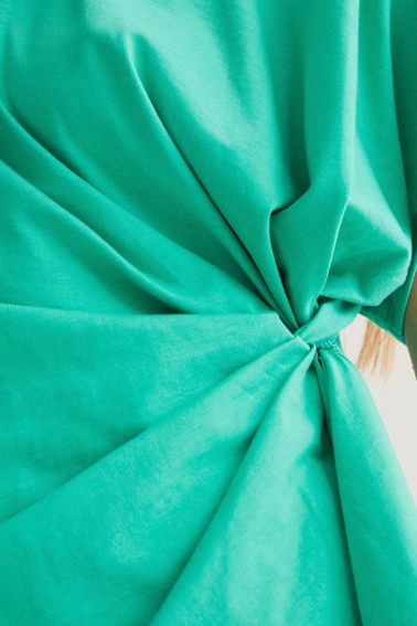 Camiseta de tejido 100% algodón de color verde. Cuello redondo y manga corta. Cintura drapeada con nudo lateral. La modelo mide 173 cm y lleva la talla S.