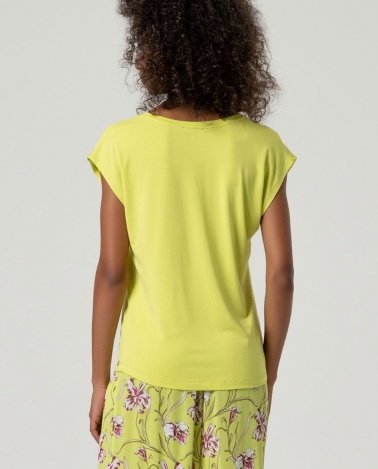 Camiseta de escote en pico y manga corta de estilo japonés. Diseño de silueta recta con bajo redondeado y longitud a la cadera. Confeccionada en tejido de viscosa de bambú y elastano de tacto suave, acabado ligero y caída fluida