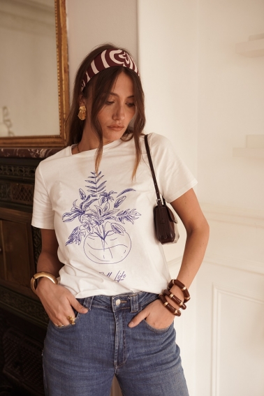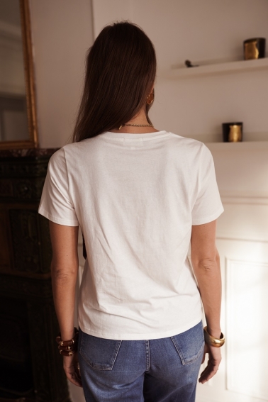 Camiseta de manga corta en tono blanco con delicado estampado delantero .