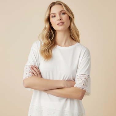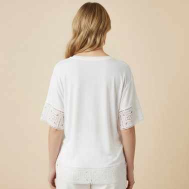 Camiseta larga manga corta con encaje de color blanco