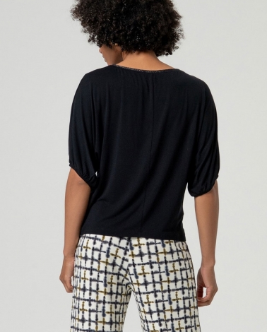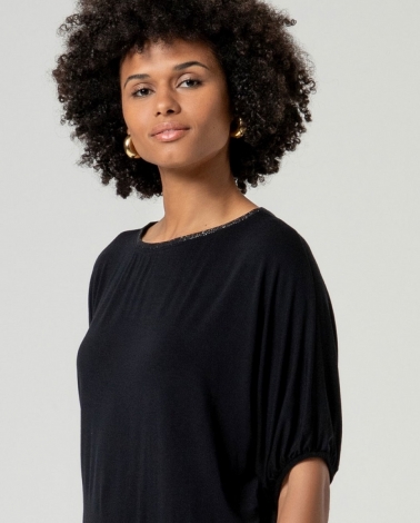Camiseta de manga corta, manga abullonada, en tejido de viscosa con detalle en el cuello en hilo de lurex .