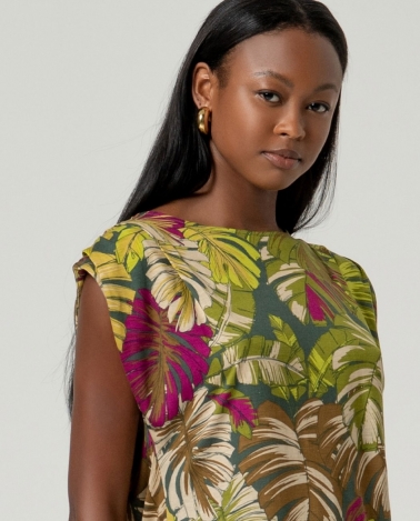 Top sin mangas con escote redondo y detalle drapeado en hombros. Corte recto y caída fluida. Confeccionado en Lyocell estampado