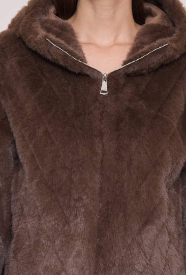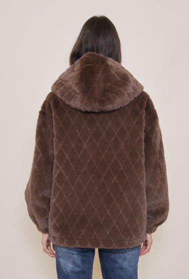 Cazadora efecto piel con capucha , bolsillos laterales , forro interior .