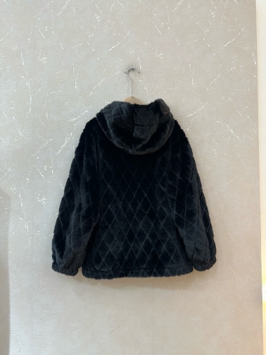 Cazadora efecto piel con capucha , bolsillos laterales , forro interior .