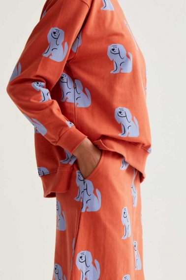 Falda midi con tejido de algodón estampado de perros . Cintura fija elástica de tiro alto. Ligera abertura trasera. Detalles acabados en rib. La modelo mide 177 cm y lleva la talla S.