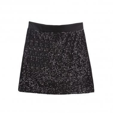 Falda pailettes corta en color negro , con cremallera en la espanda y cinturilla
