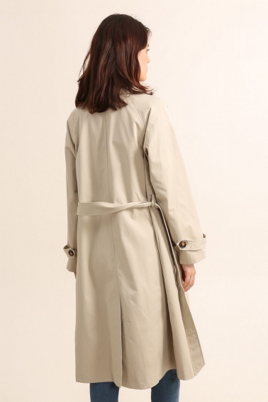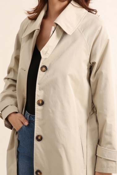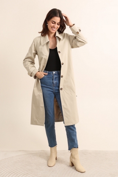 Gabardina larga con cuello camisero y cierre frontal con botones. Cinturón a juego para anudar en la cintura para una silueta ajustada.