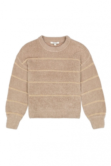 Suéter con estampado de rayas. Este suéter presenta cuello redondo, mangas largas y corte regular. Está confeccionado con 36 % poliéster, 36 % poliéster reciclado, 23 % poliamida y 5 % hilo metálico.