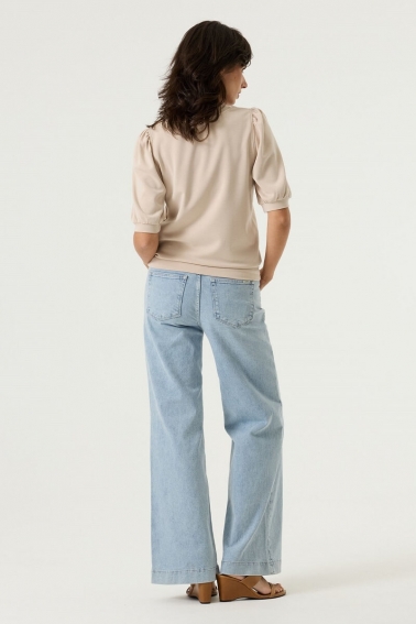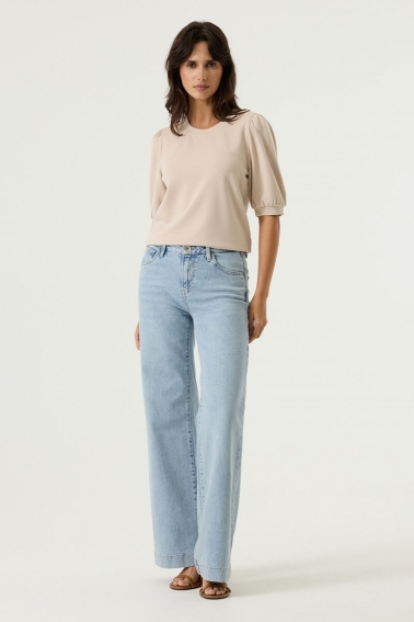 Suéter de modal suave. ¡Perfecto para un look casual! Este suéter presenta mangas cortas abullonadas, cuello redondo y corte holgado. Está confeccionado con 51 % modal, 44 % poliéster y 5 % elastano.