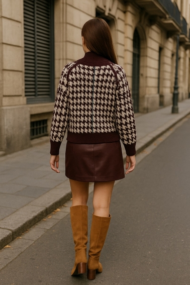 Jersey de lana en estampado de pata de gallo con cuello alto de color granate .