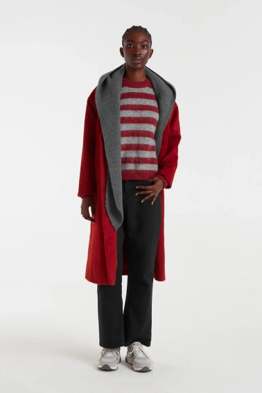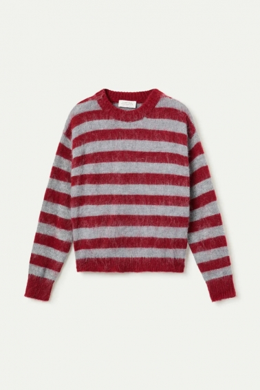 Jersey punto con estampado de rayas gris y rojas. Cuello redondo y manga larga. Hombro ligeramente caído. Detalles en rib. La modelo mide 178 cm y lleva la talla S.