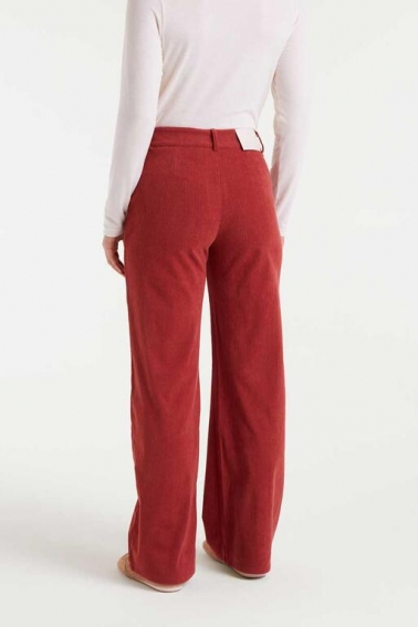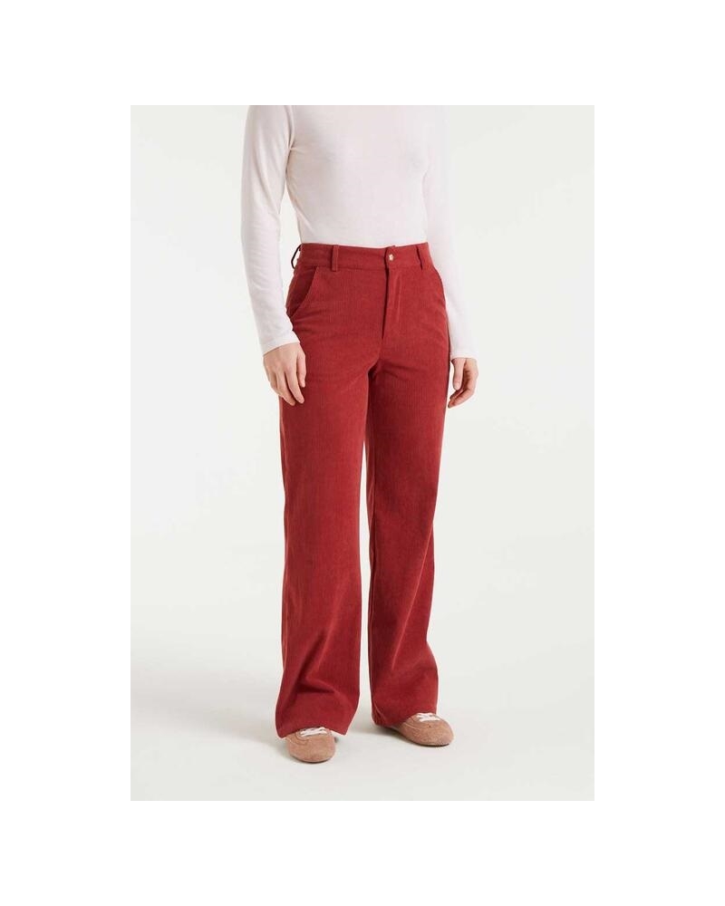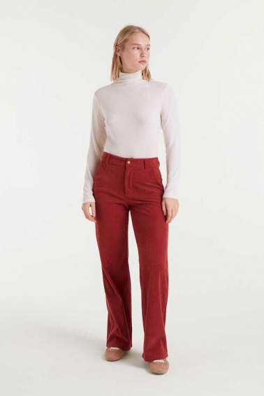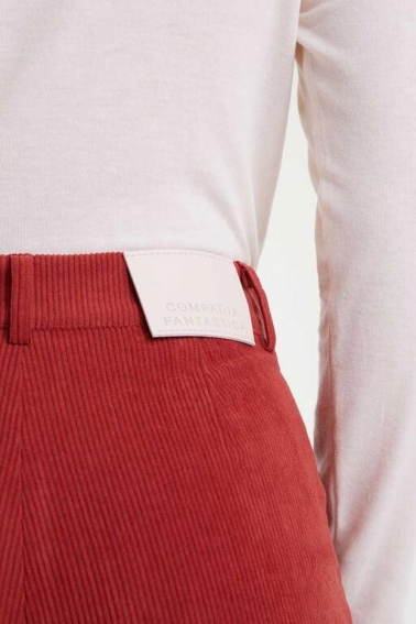 Pantalón con tejido de pana de color marrón. Con cintura fija de tiro medio y pernera de corte recto. Cierre frontal con cremallera y botón metálico. Bolsillos laterales. La modelo mide 179 cm y lleva la talla S. COMPOSICIÓN: 100% Polyester CUIDADO: Lavar a máquina en agua fría, no usar blanqueador, no usar secadora, secar colgado a la sombra, planchado a la temperatura máxima de la placa interior de 110º, lavar con colores similares | Forro: No.