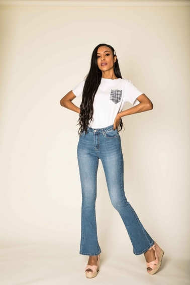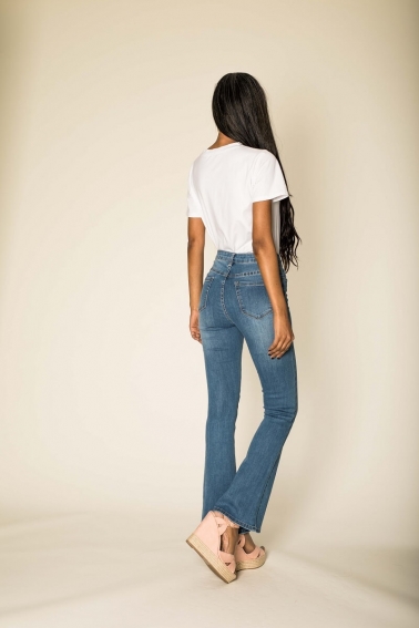 Pantalón vaquero ligeramente acampanado en la parte inferior , con elastan.