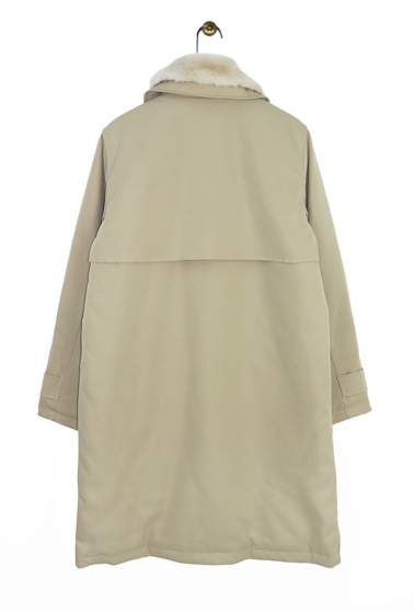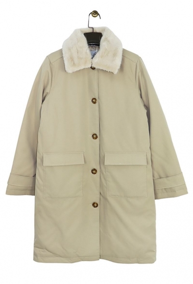 Parka acolchada con cuello desmontable de borreguito beige, con bolsillos plastones con tapa y cierre de botones .