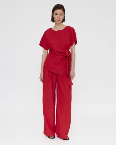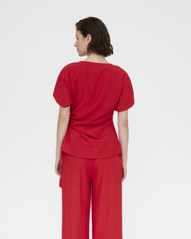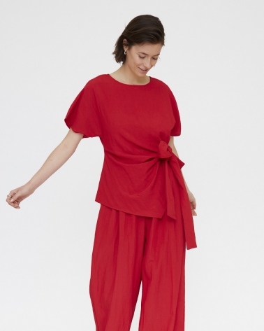 Top manga corta con lazada de color rojo , en tejido de viscisa , una prenda ideal para cualquier evento .
