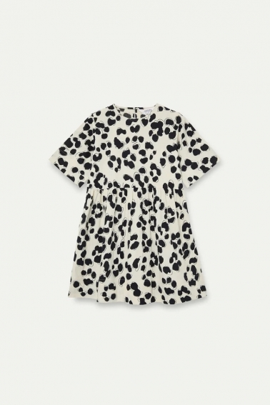 Vestido corto de tejido 100% algodón con estampado dalmatian. Cuello redondo y manga corta. Corte fluído. Cierre posterior con botón oculto. La modelo mide 177 cm y lleva la talla S.