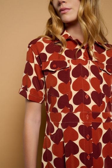 Vestido corto de corte camisero con cuello solapa estampado de corazones . Manga corta , con bolsillos plastones en el pecho y falda trapecio .