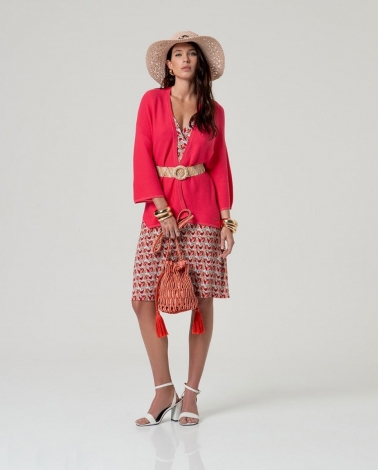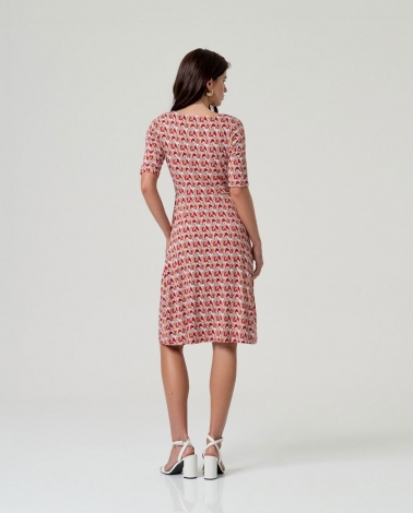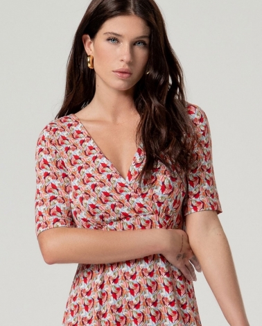 Vestido con escote cruzado estampado ,manga corta , largora hasta la rodilla .