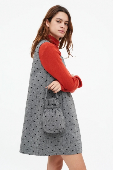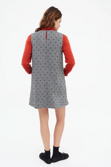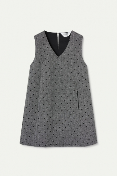 Vestido corto de tejido tweed con estampado de corazones de color negro. Con escote pico y sin mangas. Bolsillos frontales. Forro interior.La modelo mide 177 cm y lleva la talla S.