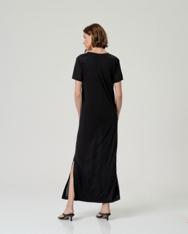 Vestido largo liso con manga corta y escote pico. Diseño recto con aberturas laterales y largo maxi. Confeccionado en tejido fluido con modal y poliéster