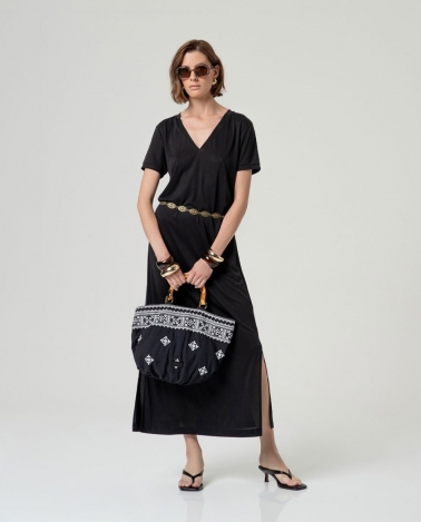 Vestido largo con aberturas escote pico negro