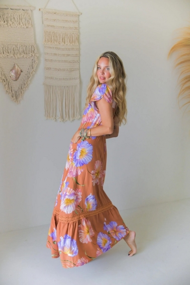 Vestido maxi de manga corta, bolsillos laterales, cinturilla elástica, botonadura delantera, con amplio vuelo rematado con un volante con detalle de ribete de croché, en un bonito estampado maxi floral multicolor sobre fondo naranja.