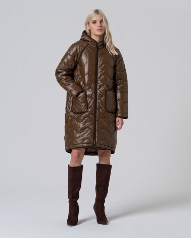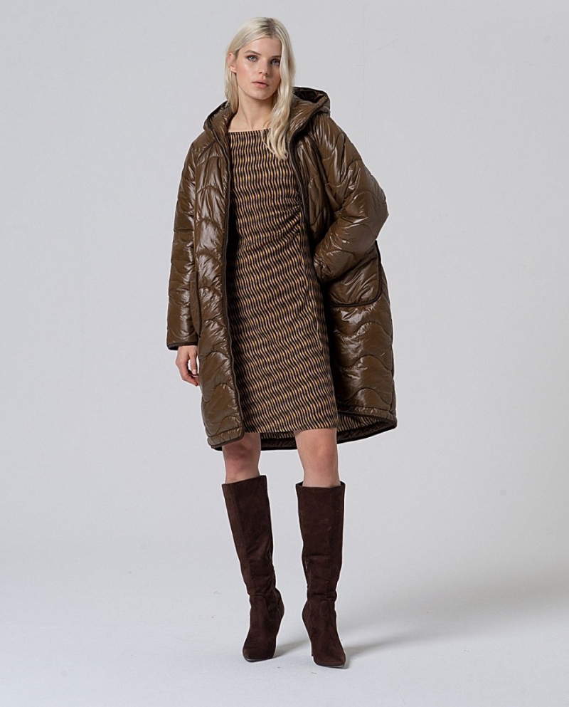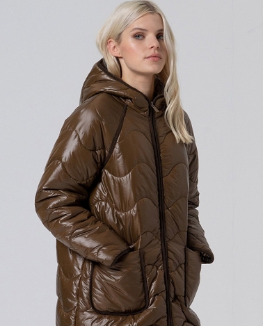Abrigo acolchacho con detalles de pana. Lleva bolsillos plastones y gorro. Composición : 100%Nylon