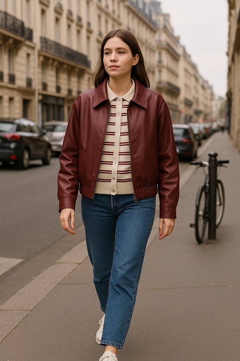 Chaqueta bomber con cuello de camisa y cremallera central. Manga larga , con puño elástico en la parte inferior . Bolsillos laterales . Ideal para looks casuales o elegantes .